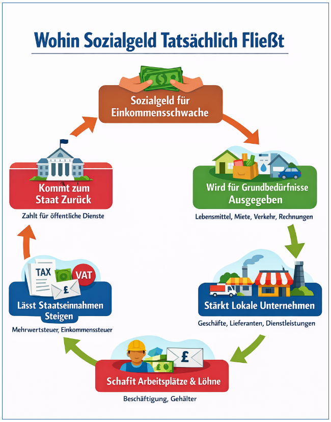 Geld, das an einkommensschwache Haushalte gezahlt wird, verschwindet nicht. Es zirkuliert. Ein Teil fließt sofort über die Mehrwertsteuer zurück zum Staat. Ein größerer Teil landet bei Supermärkten, Lieferanten, Vermietern, Dienstleistern – und damit wiederum in Löhnen, Gewinnen und Steuereinnahmen. Sobald man aufhört, Sozialleistungen so zu betrachten, als würden sie einfach in einem schwarzen Loch verschwinden, sieht die Rechnung plötzlich ganz anders aus.